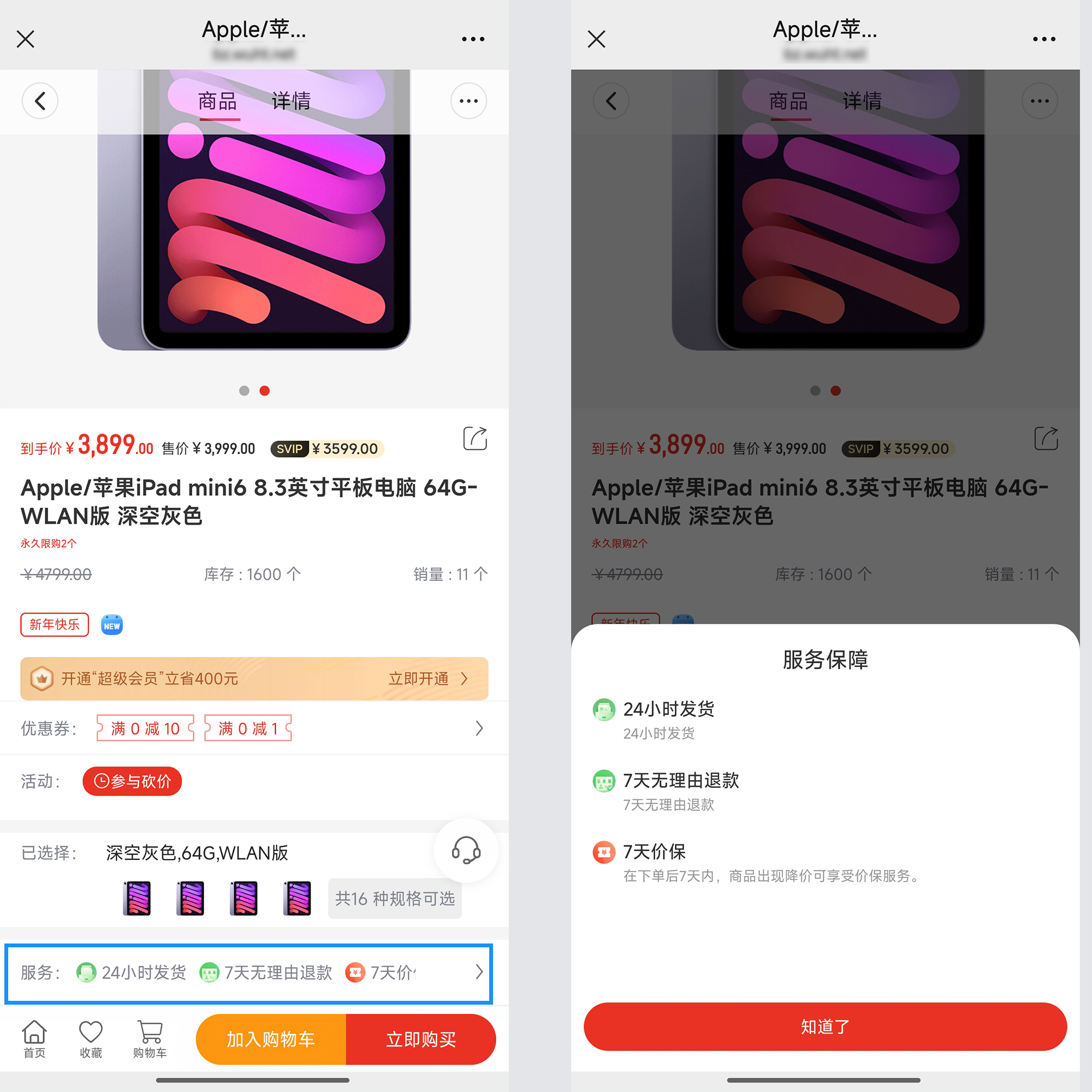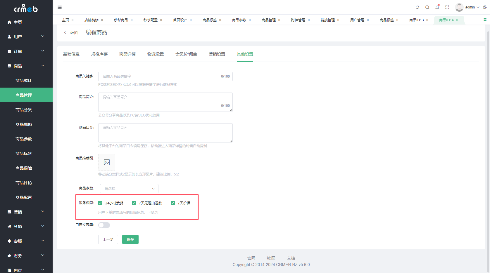 管理后台增加商品保障设置,商家可自行添加如24小时发货、7天无理由退货等服务保障内容。